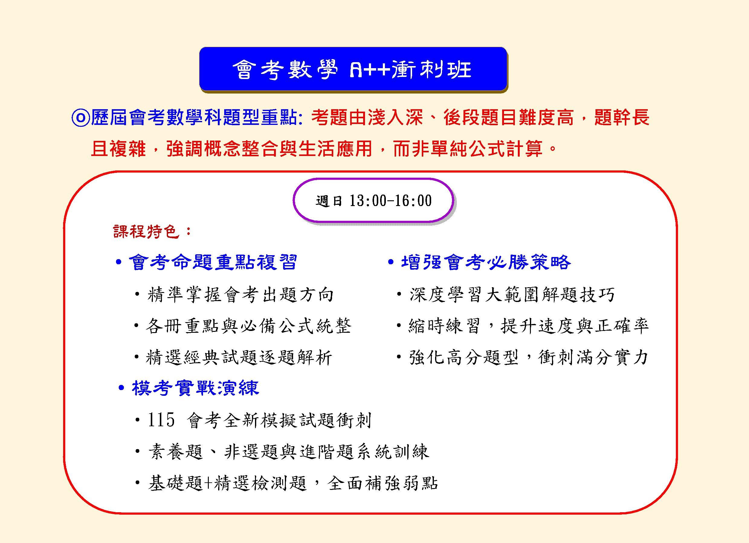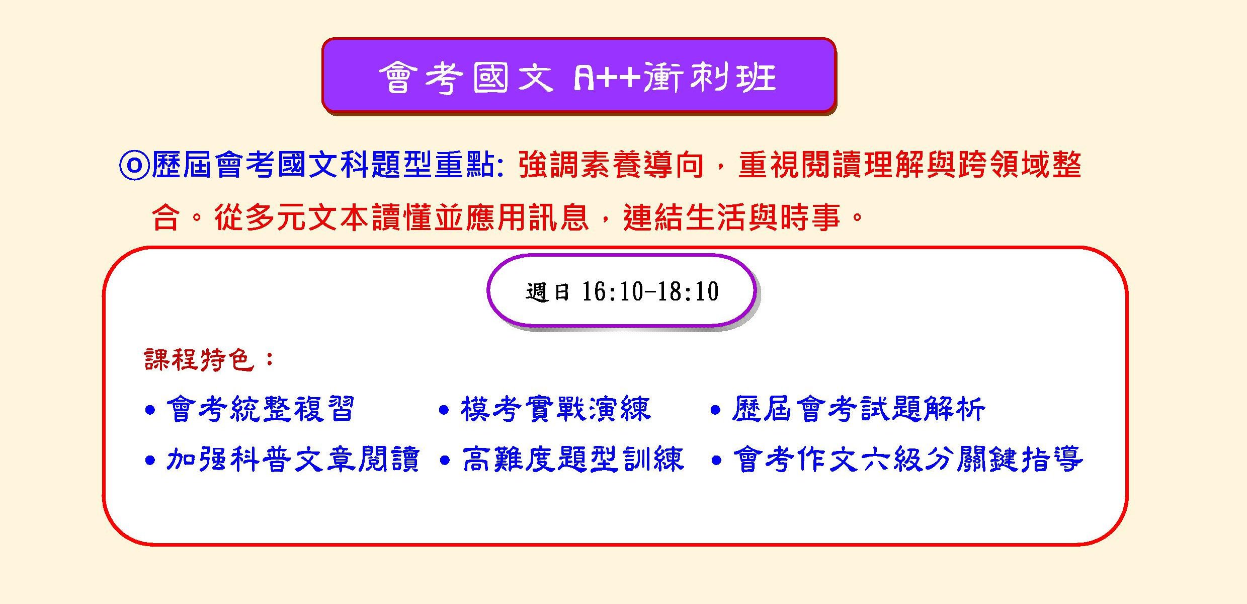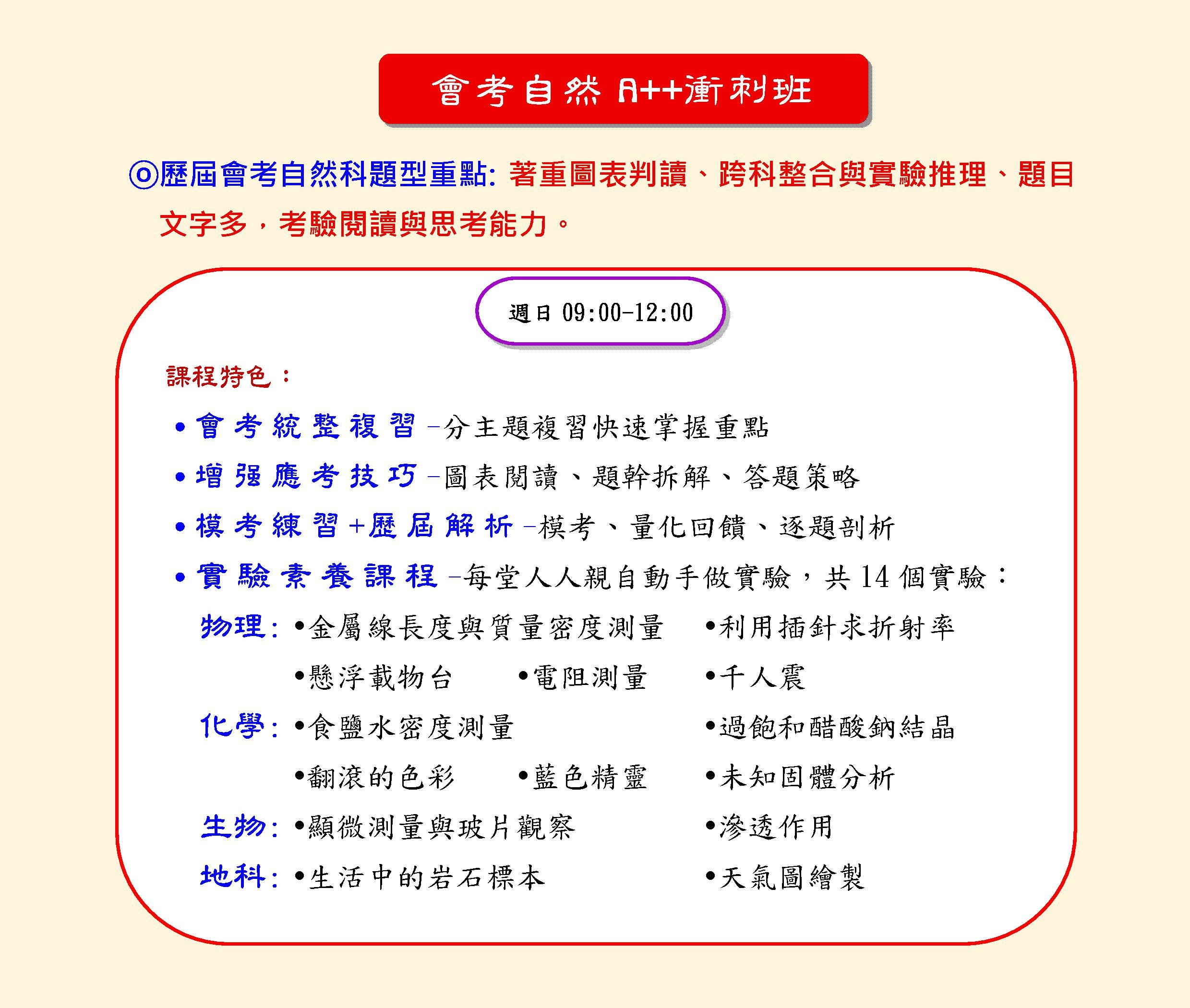 國中課程介紹 前三志願錄取率達 97% 首頁 / 課程介紹 / 國中課程 2025年7-12月 2026年1-6月 自然班 數學班 國文班 Previous image Next image 。國中自然科 國中自然班分自然資優班、自然超強先修班進度,特聘長期專精於數理實驗課程的一流名師、以每堂課人人親自動手做實驗的獨特教法進行教學,訓練學生實驗操作、探究實作、撰寫報告及分析能力,課程加深、加速、加廣,理論實驗並重,歡迎目標科學班、數理資優班及第一志願高中者最佳選擇。 七年級 八年級 九年級 班級 時段 備註 理化實驗先修班 (日) 09:00-12:00 第三冊 理化實驗超修班 (六) 15:10-18:10 三、四冊 理化實驗超修班 (日) 13:00-16:00 三、四冊 看課程內容 班級 時段 備註 理化實驗資優班 (六) 14:00-17:00 四、五冊 理化實驗超強班 (六) 15:10-18:10 五、六冊 看課程內容 班級 時段 備註 會考自然衝刺班 (日) 09:00-12:00 會考統整 看課程內容 。國中數學科 國中數學分數學資優班、數學超強先修班,資優班由-臺大江政融博士親自指導,超強先修班特聘曾任建中科學班、數理資優班-李宗憙老師親自指導,課程加深、加速、加廣,統合各版本教材編寫「理論知識與解題方法」並重的獨特教材,提供多種思考學習模式、高效率提升數學實力與解題技巧,讓你參加科學班、數理資優班及會考數學勇奪高分。 七年級 八年級 九年級 班級 時段 備註 數學超強班 (日) 09:00-12:00 第三冊 看課程內容 班級 時段 備註 數學資優班 (日) 09:00-12:00 四、五冊 數學超強班 (六) 18:40-21:40 五、六冊 看課程內容 班級 時段 備註 會考數學衝刺班 (日) 13:00-16:00 會考統整 看課程內容 Previous image Next image 。國中國文科 運用問題導向學習法,提升閱讀及寫作能力。 以各類型文本的閱讀策略及寫作方法為教學主題,培養學生國文素養力。 結合文字、音樂、繪畫、影音等不同教材,進行新舊經驗及生活情境的連結。 透過大量習作及教師對學生的專業學習觀察,彈性調整教法及課程,並以課堂寫作檢驗學習成效,建立學生的學習策略,追求最大效益。 教師親自批改文章,批改後立即檢討,小班制針對個人弱點指導,增加學習效果。 七~八年級 九年級 班級 時段 備註 閱讀寫作精修班 (六) 18:30-20:30 2/15起 看課程內容 班級 時段 備註 會考國文衝刺班 (日) 16:10-18:10 看課程內容 最新消息 特色優勢 立即報名