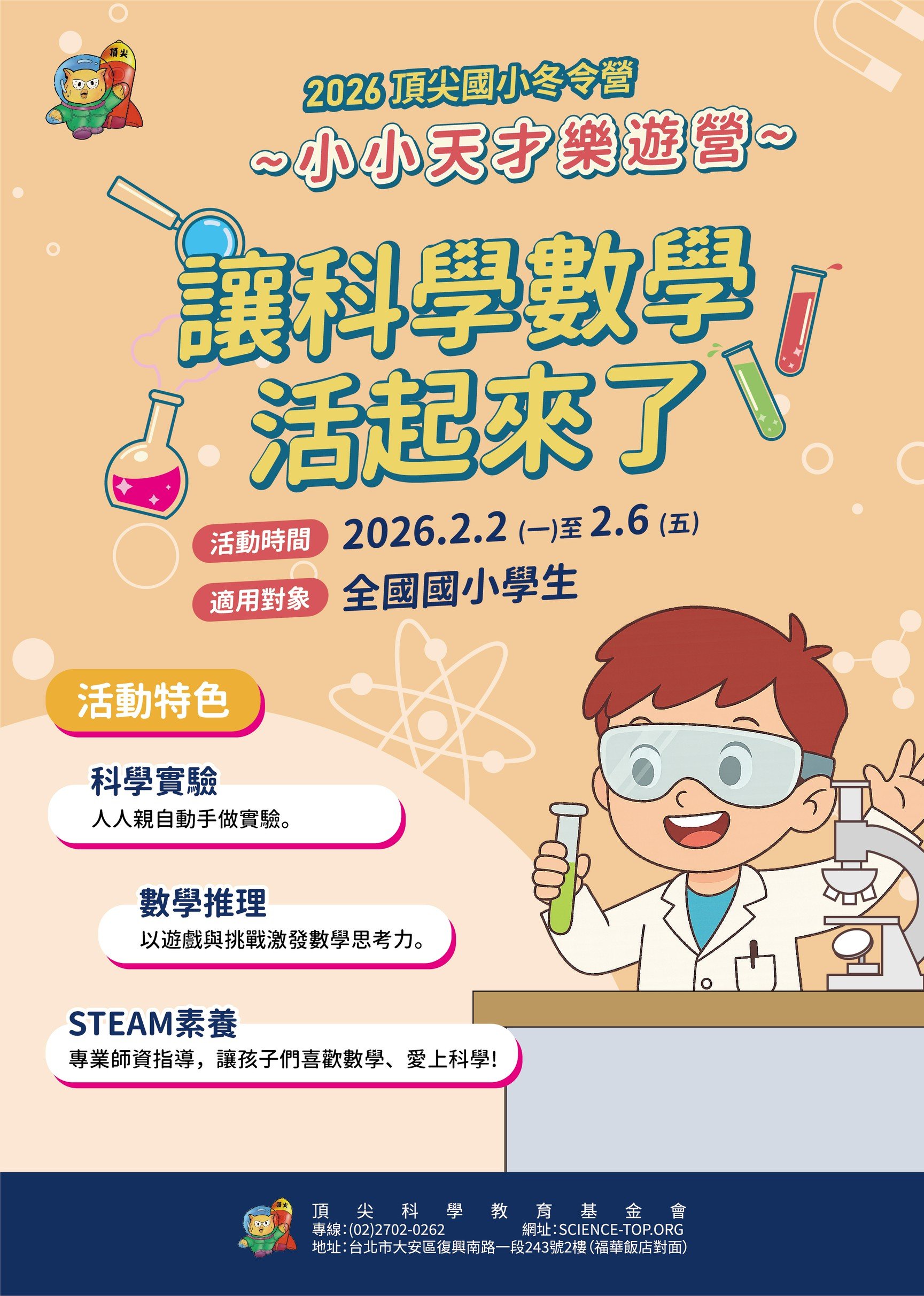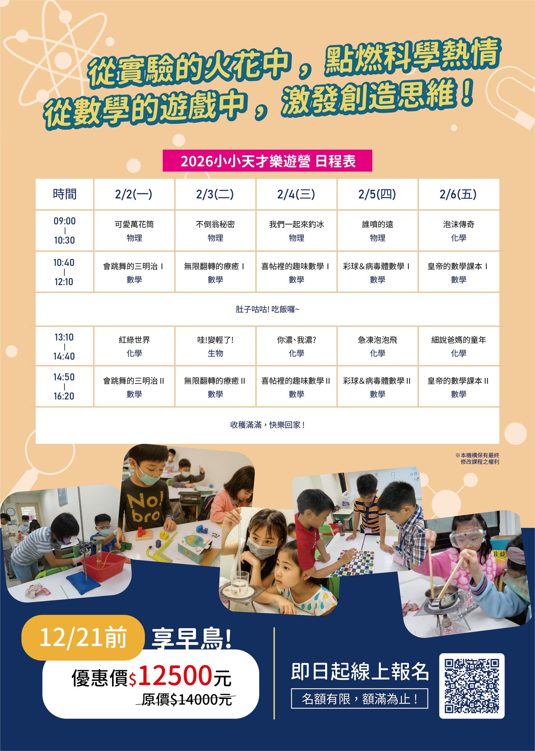 科學、數學活起來!2026寒假-小小天才樂遊營-12/21前享早鳥冬令營科學、數學活起來!2026寒假-小小天才樂遊營-12/21前享早鳥科學、數學活起來!2026寒假-小小天才樂遊營-12/21前享早鳥2025 年 10 月 26 日 冬令營, 國小部 2026寒假冬令營小小天才樂遊營 Previous image Next image 營隊資訊【招生對象】國小一~六年級【營隊時間】2026.2/2-2/6 (5天) 09:00-16:20【營隊費用】14000元,12/21前繳清享早鳥12500元【費用包含】教材、實驗器材、教具、藥品等及午餐與保險【師生比例】低於1:10【報到時間】08:30~09:00 我要報名